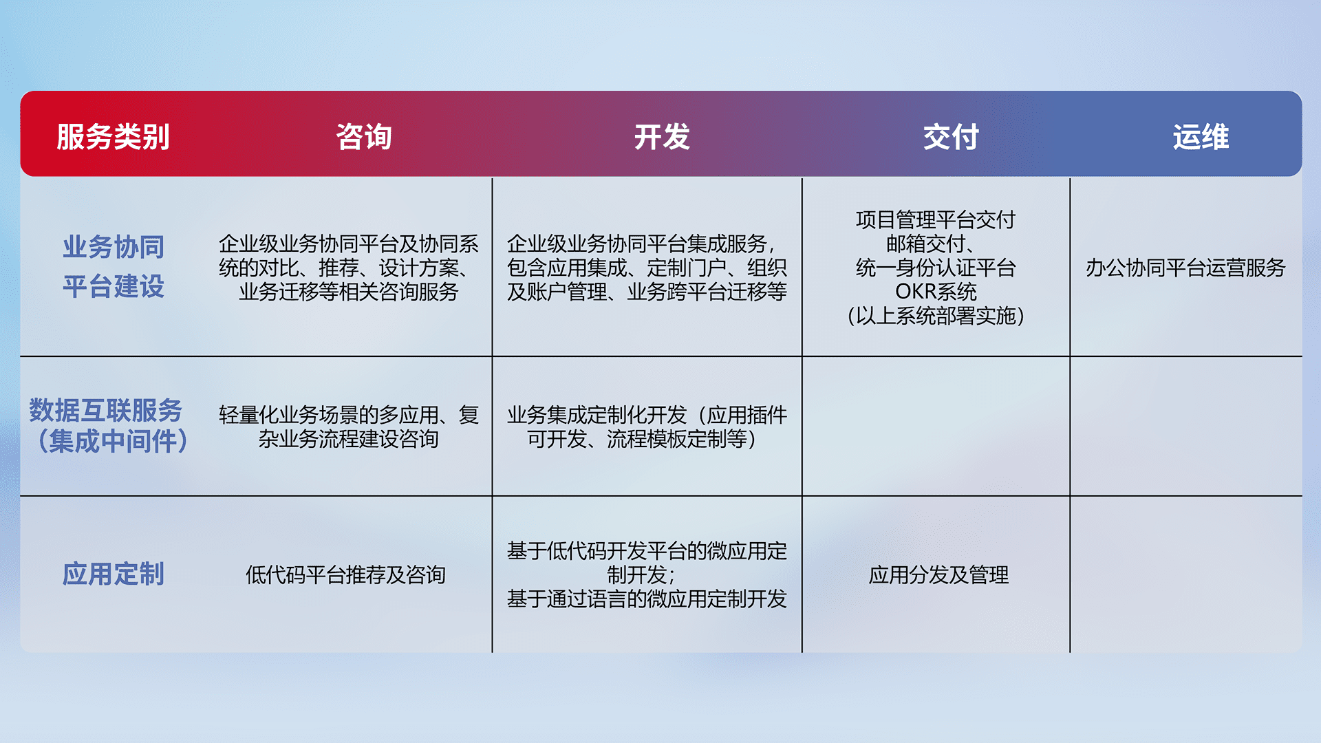 针对钉钉、、、企微、、、IDaas等平台级产品提供产品的规划、、、、方案、、、、交付、、、定制化开发等服务,,实现如统一协同办公、、、智能客户服务、、混合会议管理、、、智能数据查询、、、、等业务场景,,,,实现数字化转型。。。