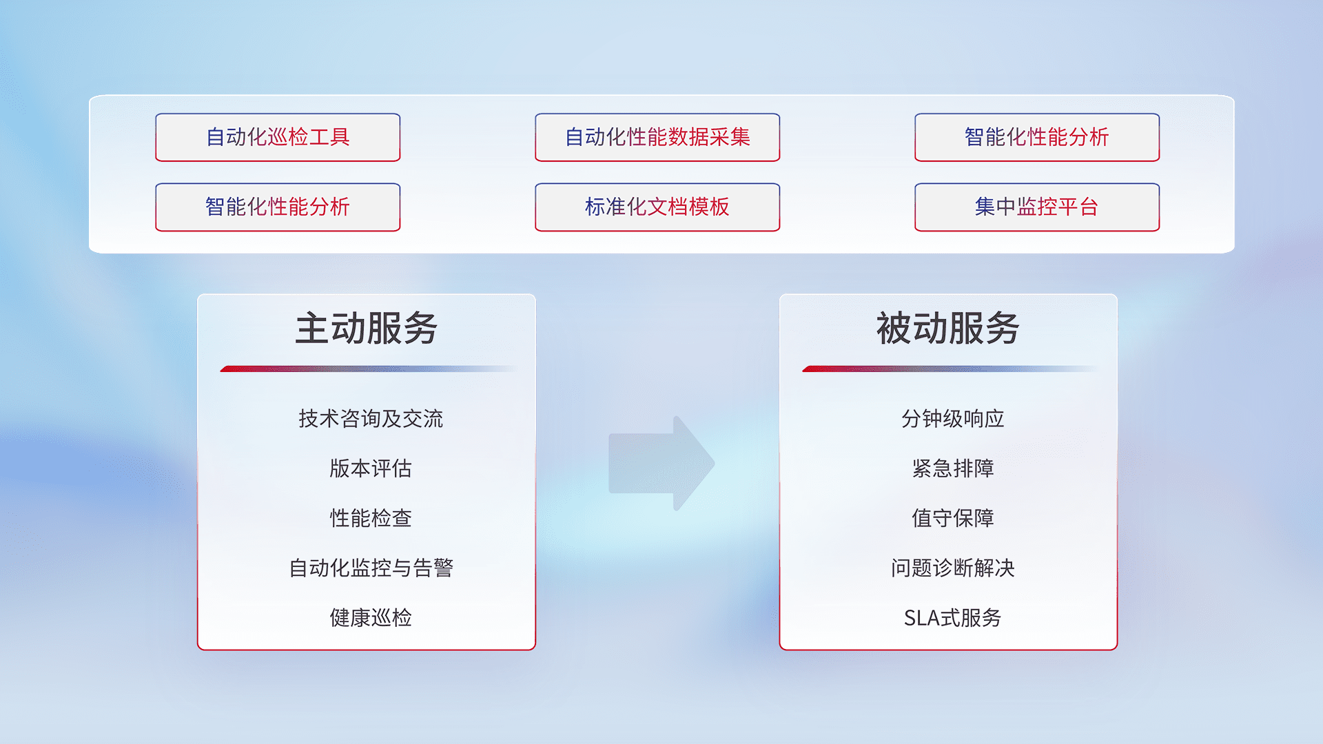 智能化工具和标准化文档,,保障服务质量,,,提供主动服务(包含技术咨询、、版本评估、、性能检查、、自动化监控与告警、、健康巡检)和被动服务包含(分钟级响应、、、、紧急排障、、、、值守保障、、、问题诊断解决、、、、SLA服务)。。